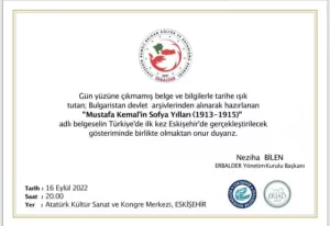 ERBALDER, ERİAD ve Eskişehir Büyükşehir Belediyesi’nin organizasyonu ile Türkiye’de ilk defa yapılacak “Mustafa Kemal’in Sofya Yılları (1913-1915)” belgeselin gösteriminde buluşmak dileğiyle…